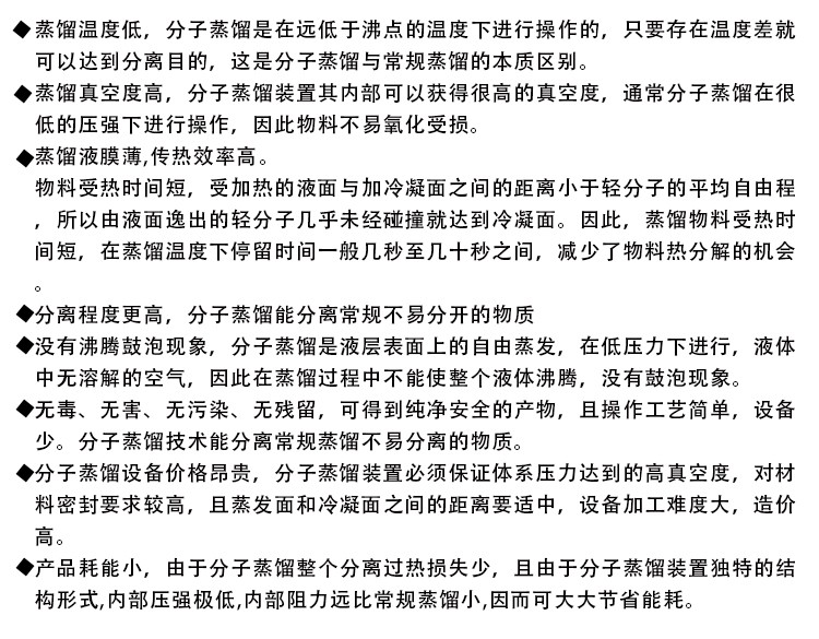 ? 分子蒸餾是一種在高真空下操作的蒸餾方法,這時(shí)蒸氣分子的平均自由程大于蒸發(fā)表面與冷凝表面之間的距離,從而可利用料液中各組分蒸發(fā)速率的差異,對(duì)液體混合物進(jìn)行分離。