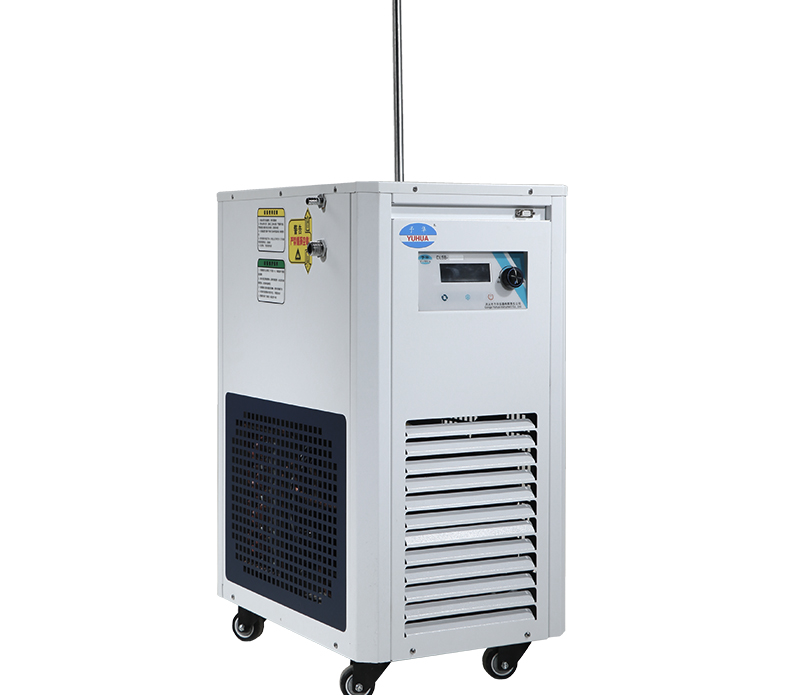本產(chǎn)品是利用兩個獨立的制冷循環(huán)組成,分別為高溫循環(huán)和低溫循環(huán)。在各單獨的制冷系統(tǒng)中充有不同性質的制冷劑,高溫循環(huán)采用中溫制冷劑,低溫循環(huán)中采用低溫制冷劑。這兩個部分通過一個冷凝蒸發(fā)器聯(lián)系起來,它即是低溫循環(huán)的冷凝器,也是高溫循環(huán)的蒸發(fā)器,高溫循環(huán)中制冷劑的蒸發(fā)用來冷凝低溫循環(huán)中的制冷劑,這樣,低度溫循環(huán)吸收的熱量(制冷量)傳給高溫循環(huán)的制冷劑,高溫循環(huán)的制冷劑再將熱量傳給環(huán)境介質。冷卻槽內壁盤有冷卻銅盤管,制冷劑(氟利昂)通過水槽內壁的盤管不斷循環(huán),對槽內冷媒進行冷卻,并通過內置循環(huán)泵、外接循環(huán)管路將冷媒輸送到配套設備夾層或冷凝盤管內,間接為反應器內物料進行降溫、對冷凝管接觸蒸汽進行冷卻、液化,該產(chǎn)品一般可連接雙層玻璃反應釜,旋轉蒸發(fā)器,各種形式的盤管冷凝器使用,也可將玻璃容器放置槽內進行內置低溫反應。